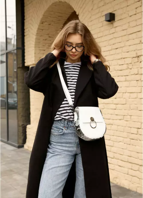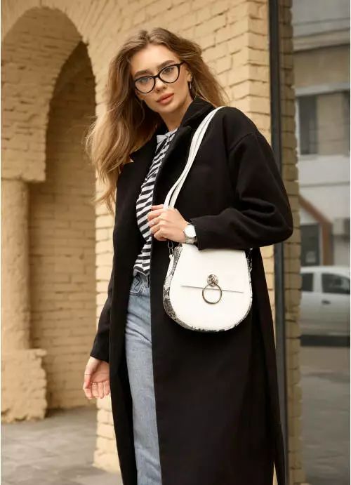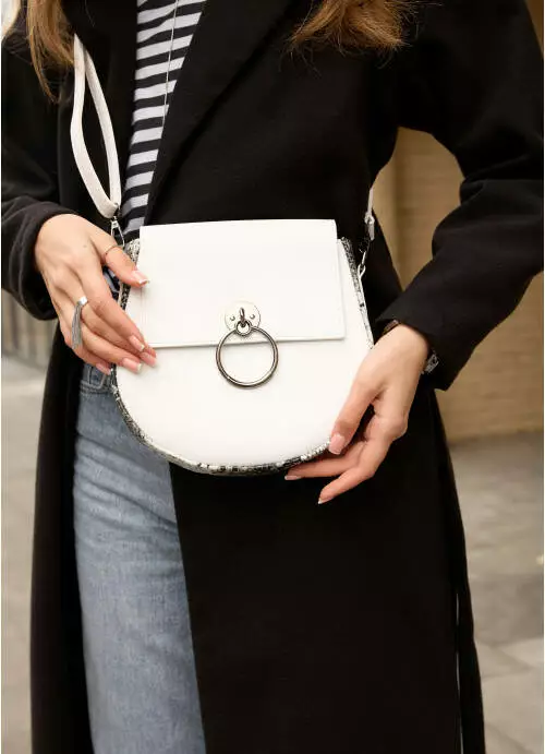 Также внутри сумка имеет карман на застежке. Клапан сумки украшен замком с магнитом в виде кольца.