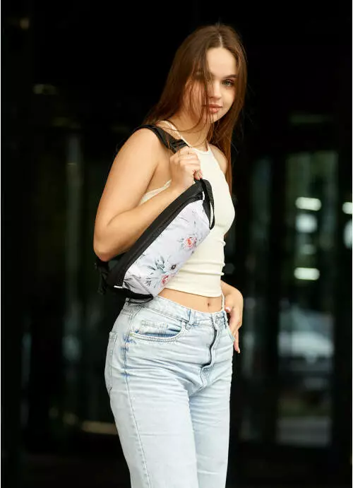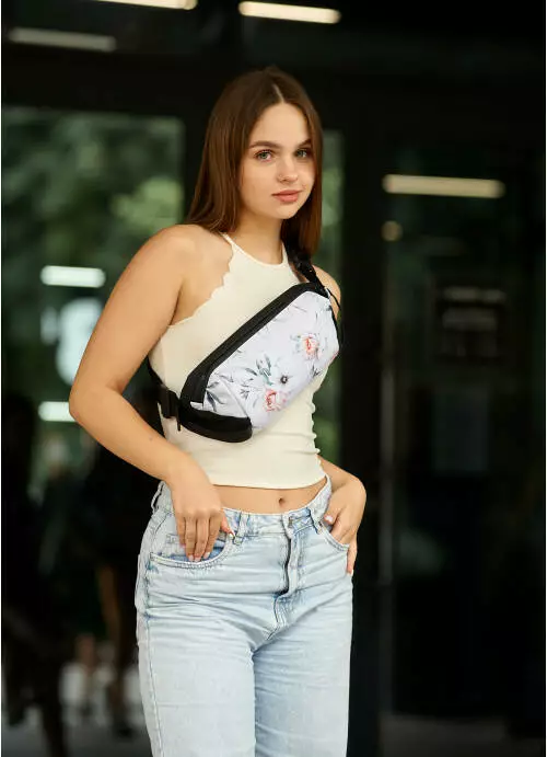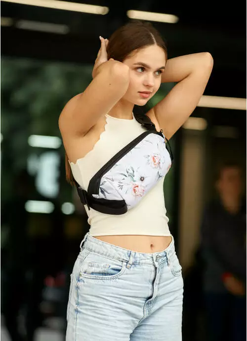 Женская сумка на пояс бананка Sambag Holster MSH черная тканевая с цветочным белым принтом