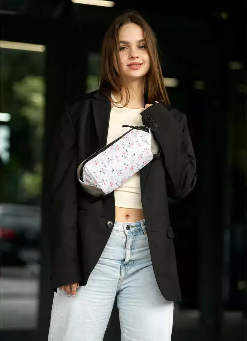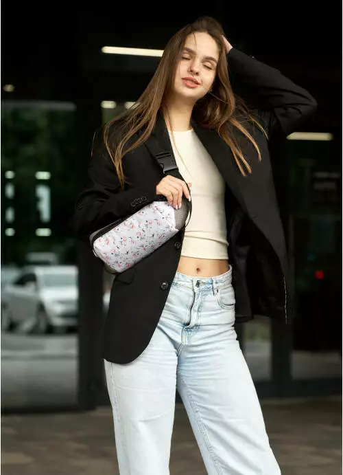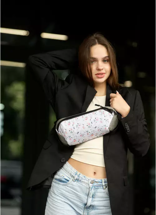 Женская сумка на пояс бананка Sambag Holster MSH серая тканевая с цветочным белым принтом
