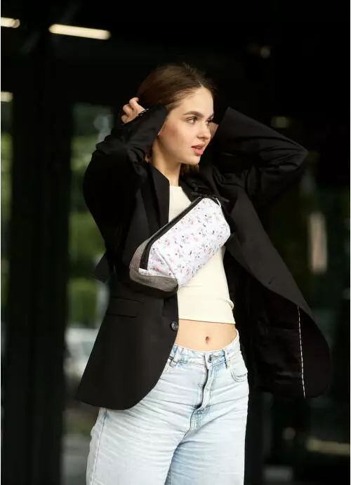 Жіноча сумка на пояс бананка Sambag Holster MSH сіра тканева з квітковим білим принтом