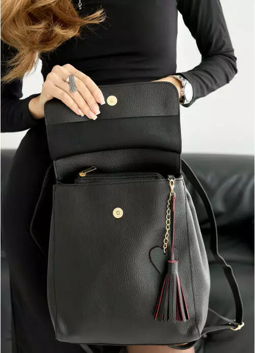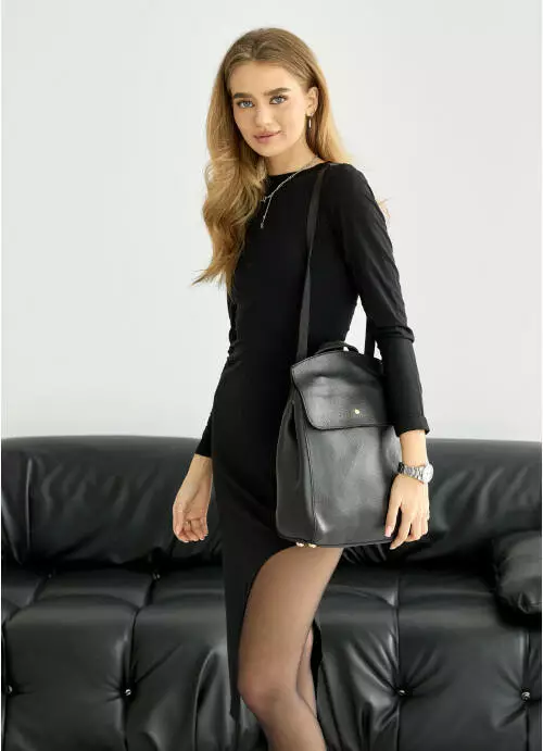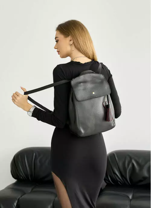 Выполненный из экокожи, клапан рюкзака на кнопке, дополнительно имеется косточка, может открепляться. Основное отделение закрывается молнией.